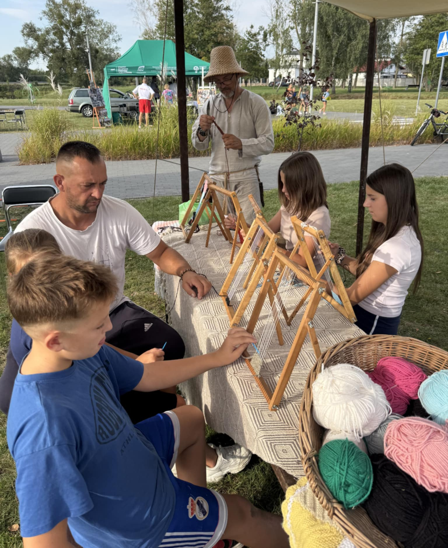 Warsztat plecionkarski - uczestnicy zapoznali się z procesem wyplatania z wikliny. Przy stoisku dzieci wykonywały rybkę na wędce, i podobnie jak powyższe prace, oczywiście mogły zabrać ze sobą.