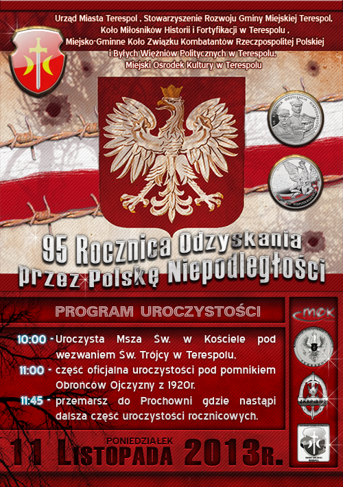 Uroczystości związane z obchodami 95 rocznicy odzyskania przez Polskę Niepodległości rozpoczęły się w Terespolu o 10.00 uroczystą Mszą Świętą w Kościele p.w Świętej Trójcy. Następnie odbył się przemarsz wszystkich uczestników pod Pomnik Niepodległości i Obrońców Ojczyzny gdzie zostały złożone wieńce i kwiaty przez Kombatantów, władze samorządowe Powiatu i Miasta Terespol oraz przedstawicieli Policji, SG, UC, a także delegacje szkół, różnych instytucji i organizacji działających na terenie miasta. W trakcie uroczystości głos zabrali, burmistrz Jacek Danieluk i przedstawiciele Kresowego Bractwa Strzelców Kurkowych im. Orła Białego: dr Szczepan Kalinowski oraz Lech ,,Prawdzic" Orliński. Pieśni patriotyczne zaśpiewały terespolskie uczennice: Zuzanna Wic, Patrycja Masiuk, Dominika Planda i Julia Iwaniuk.