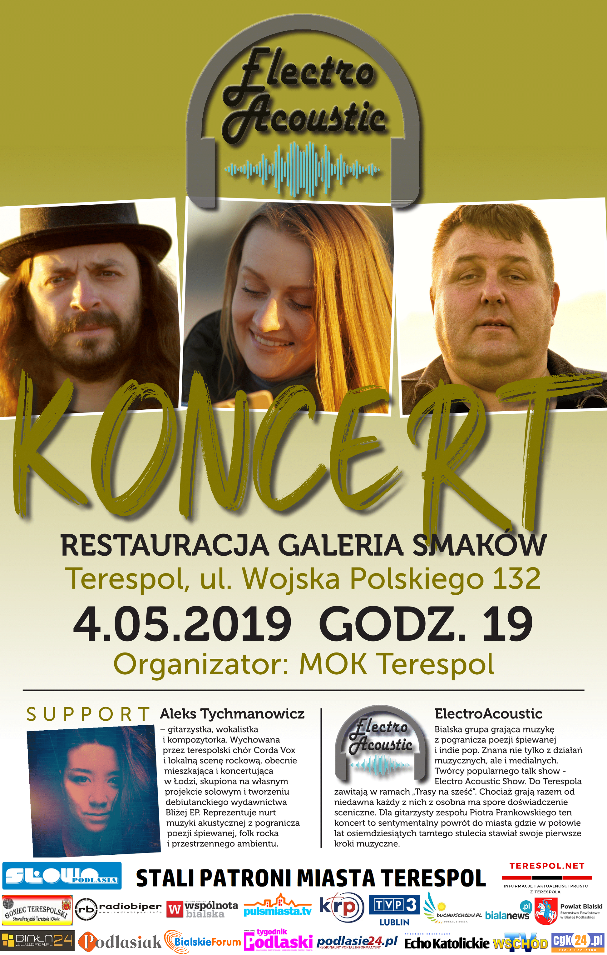 Po miłym poczęstunku na scenie pojawili się panowie z Maleńczuk Acoustic Trio, którego liderem i wokalistą jest świetnie znany terespolskiej publiczności – Janusz Maleńczuk. Dodatkową atrakcją imprezy była wystawa pracowni plastycznej i ceramicznej z MOK.