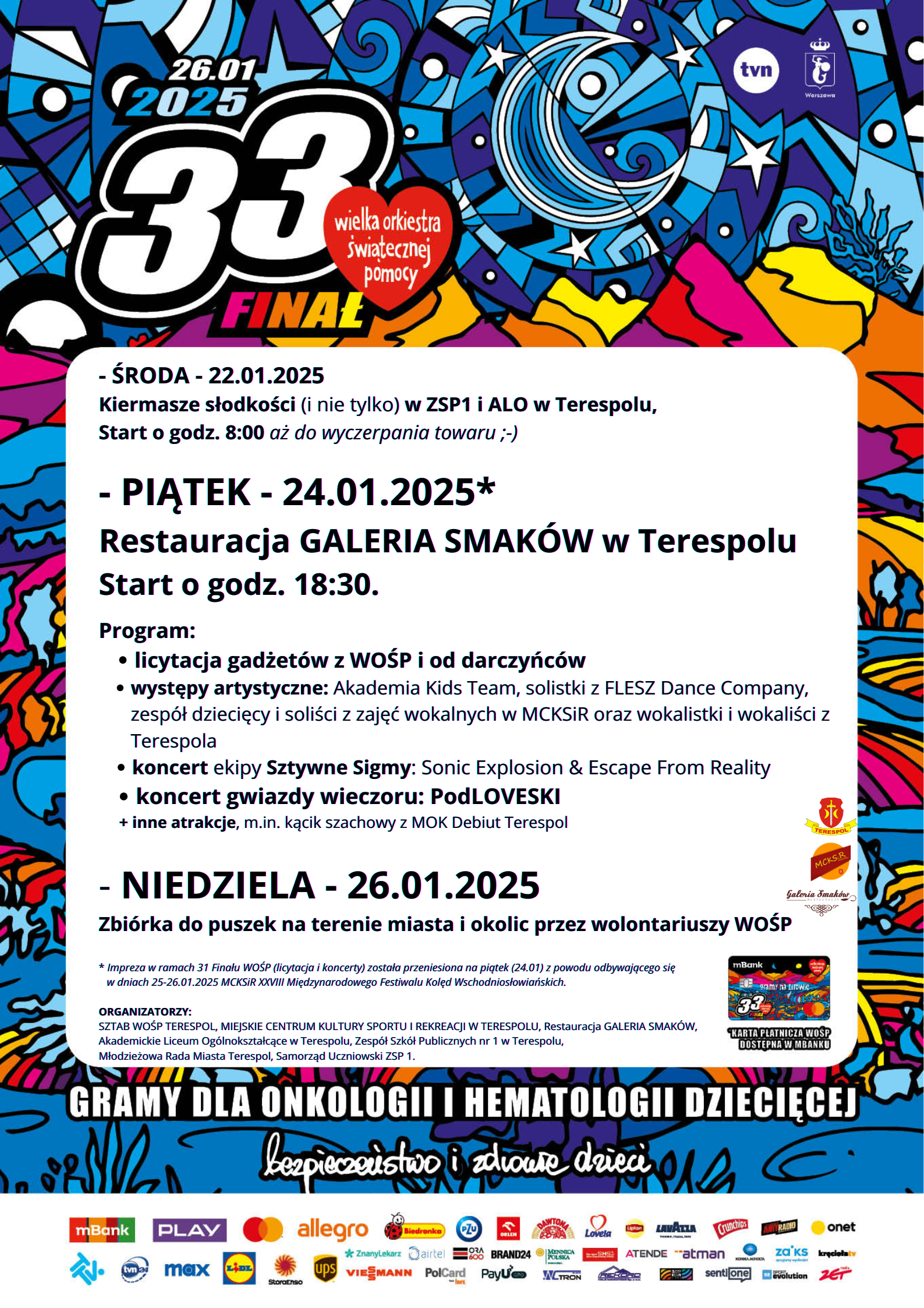W ostatnią niedzielę stycznia (26.01.2025) odbył się 33 Finał Wielkiej Orkiestry Świątecznej Pomocy! W tej jednej z największych akcji charytatywnych na świecie Terespol tradycyjnie bierze czynny udział.